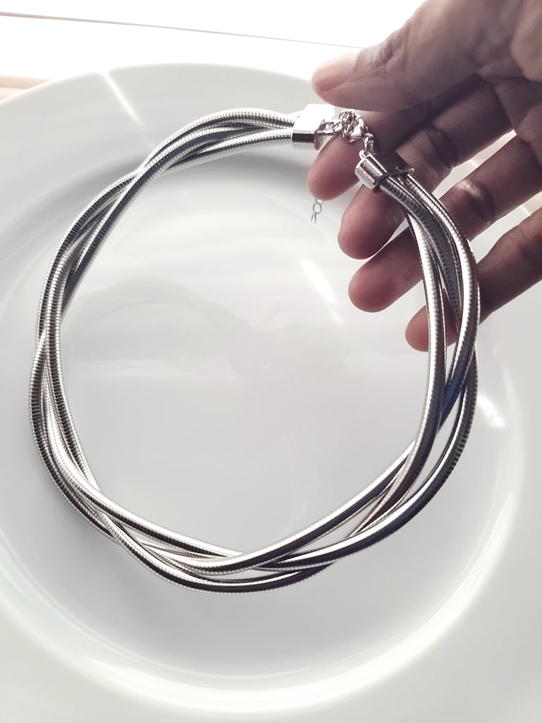 Wrap your neck in bold attitude with this silver-tone triple flex snake chain choker. Three interlocking strands create a striking, dimensional look that commands attention. The flexible design moves with you for all-day comfort, while the sleek snake chain texture adds an edge to any outfit. Perfect for layering or wearing solo, this choker brings serious style to your jewelry collection.